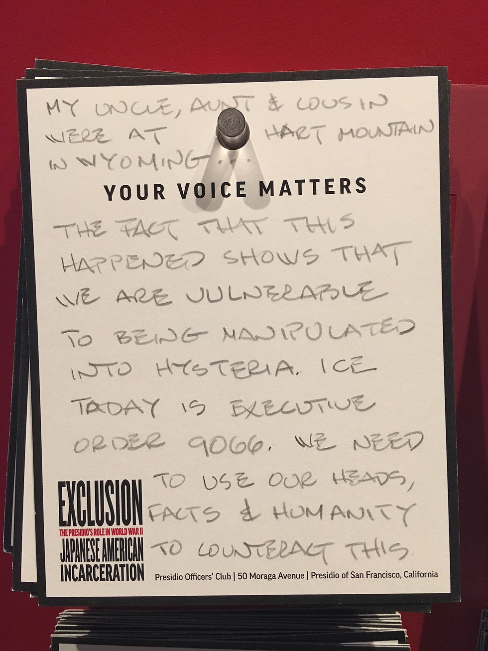 We spend the next several days in San Francisco where we visit the Presidio, a gorgeous area on the bay that overlooks the Golden Gate Bridge. It used to the home to both Spanish and American military bases, but today it is a collection of museums and protected wildlife spaces. One of the exhibits is a retrospective on the Presidio's role in Japanese internment, it is a powerful exhibit that has been extended by more than a year because of its popularity and relevance to today's politics. Ironically, the most moving portion of the exhibit for me is not the artifacts or analysis--is is the reflections from other visitors. I still on the floor in front of a wall where note cards are hung up with the thoughts of those who have walked this museum prior. I get lost in their simple observations, in the profoundness of their thoughts and worries.